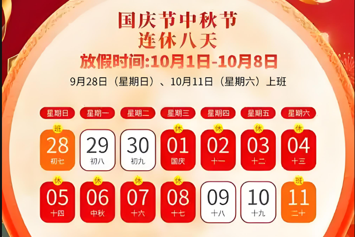 2025年國慶節(jié)、中秋節(jié)連休。根據(jù)《國務(wù)院辦公廳關(guān)于2025年部分節(jié)假日安排的通知》規(guī)定,
